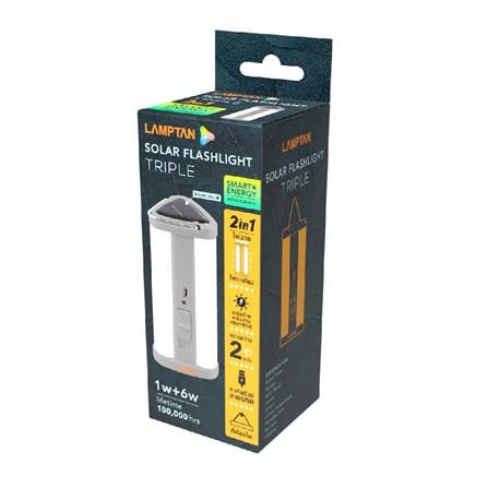 ไฟฉายแอลอีดี รุ่น TRIPLE จาก LAMPTAN ไฟฉายพลังงานแสงอาทิตย์ที่สามารถปรับใช้เป็นไฟฉายทั่วไปและตะเกียงไฟได้ตามต้องการ ส่องสว่างไกลในระยะ 110 เมตร ด้วยแสงโทน DAYLIGHT อีกทั้งมีรูปทรงที่จับกระชับมือ และมีที่ห้อยไฟเพื่อการใช้แคมป์ปิ้งที่สะดวกมากยิ่งขึ้น มาพร้อมความจุแบตเตอรี่ที่เพียงพอต่อการเปิดใช้ต่อเนื่อง 6 ชั่วโมง และรองรับการชาร์จพลังงานแบตเตอรี่ผ่านช่องเสียบ USB
